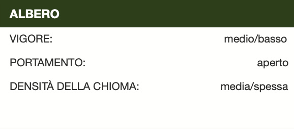 Varietà di medio-bassa vigoria, comportamento aperto e internodi corti. Con una struttura legnosa bassa, mantiene una grande quantità di rami produttivi in tutto l’albero. La sua struttura morfologica la rende ideale per la coltivazione da siepe, permettendo di formare e mantenere facilmente l’albero in una falsa palmetta, facilitando la chiusura degli spazi nella linea e la rapida creazione della siepe.