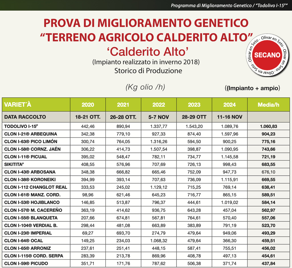 Di seguito, a titolo illustrativo, è riportato un risultato comparativo con i kg di olio/ha prodotti e la media ottenuta da Todolivo I-15P e da alcune delle 19 varietà con cui è stata messa a confronto nelle colture a “Cortijo Oeste” e “Cortijo Este”. I dati dei raccolti si riferiscono agli anni 2018, 2019, 2020, 2021, 2022, 2023 e 2024.